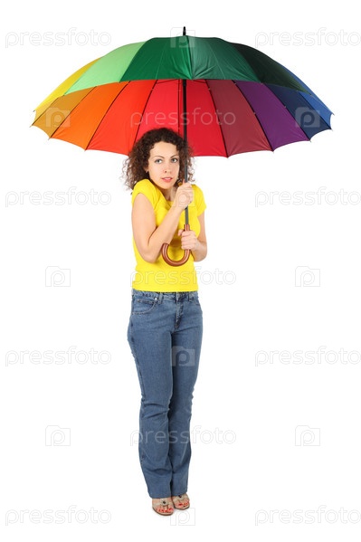 Молодая женщина мерзнет, стоя под разноцветным зонтиком