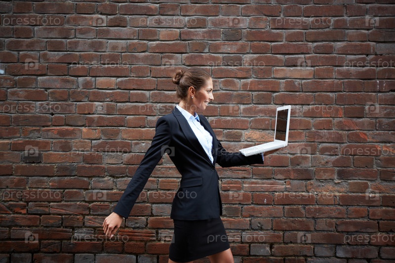 Женщина идет с нойтбуком в руке