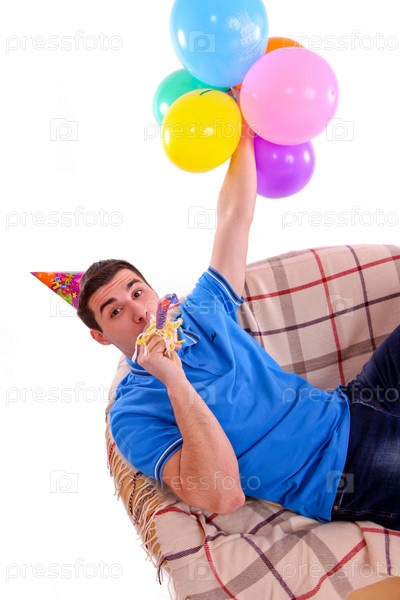 Юноша в праздничном колпаке и с воздушными шарами сидит на диване