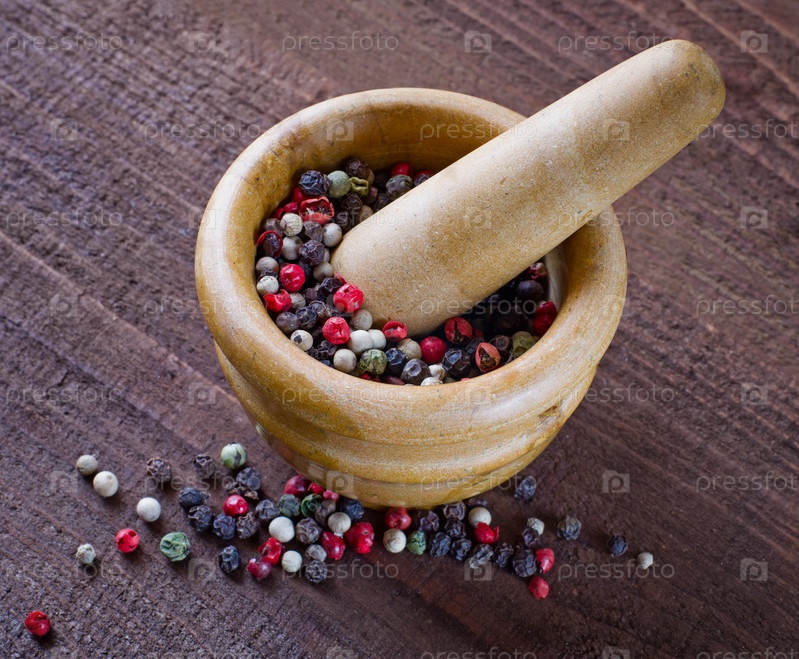 Перец в ступке и пестик на деревянном столе