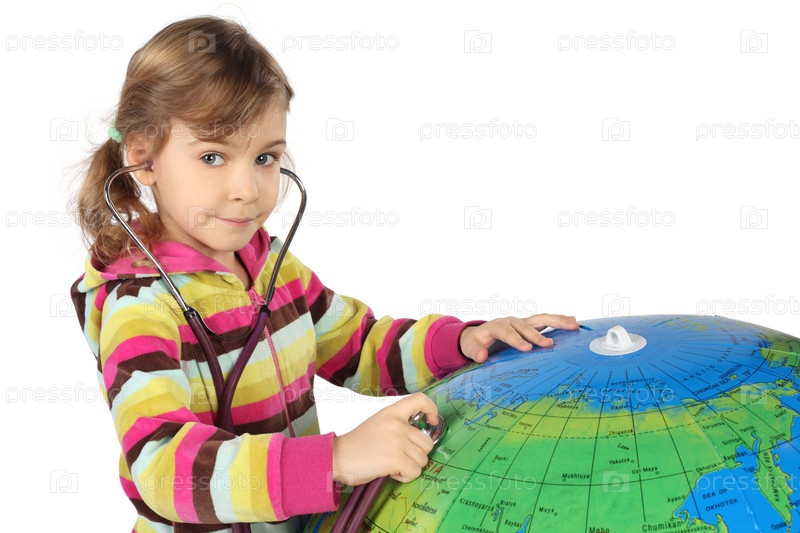 Девочка со стетоскопом слушает большой надувной глобус