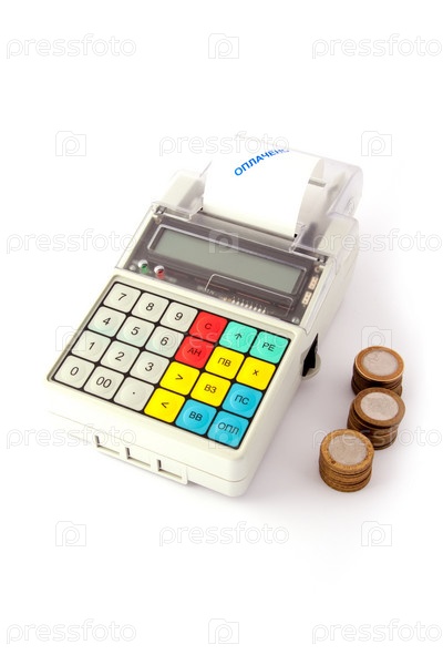 Портативный кассовый аппарат на белом фоне