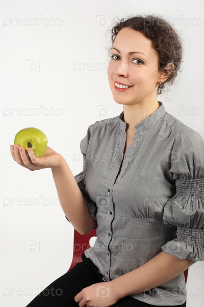 Улыбающаяся девушка держит в руке яблоко и смотрит в камеру