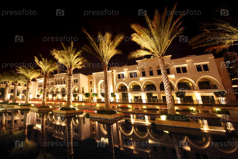 Ночь, Дубай, улица с пальмами и бассейном, Объединенные Арабские Эмираты