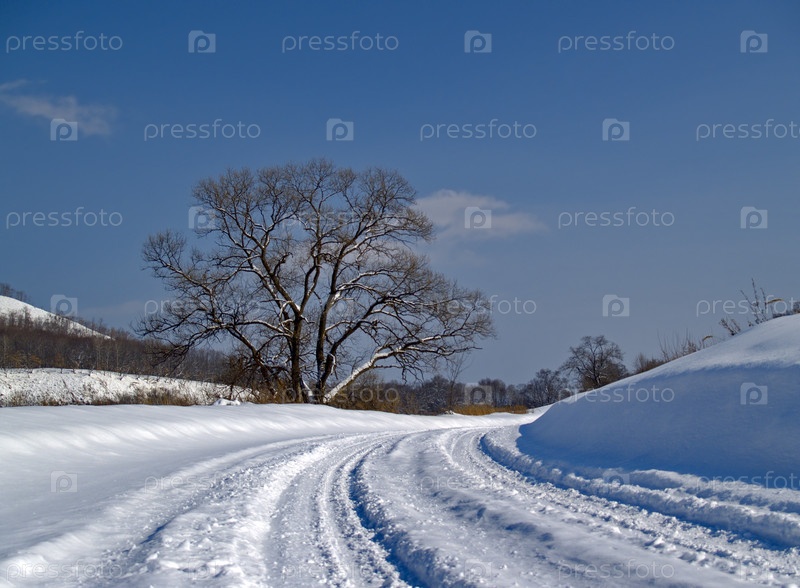 Зимний пейзаж с заснеженными дорогой и деревом на обочине