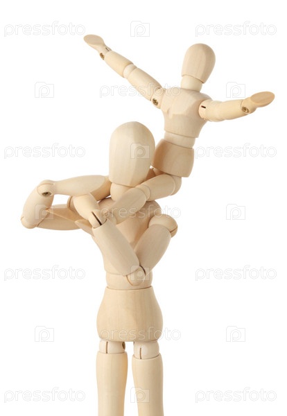 Деревянные человечки, семья, родитель держит ребенка на плечах, изолированы на белом