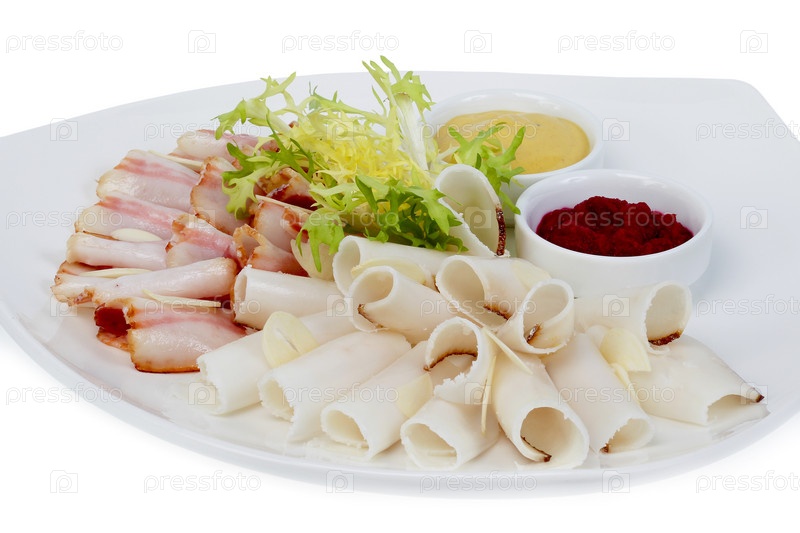 Нарезанный бекон с зеленью и горчицей на белом фоне