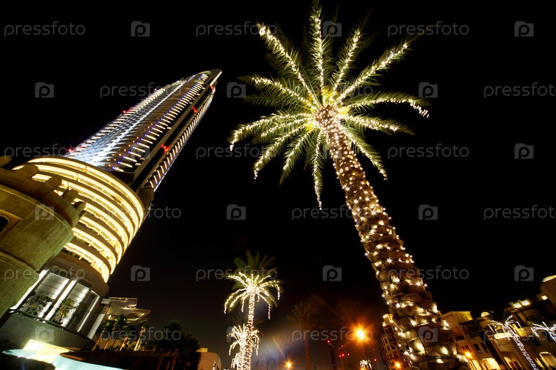 Дубай, небоскреб Бурдж Дубай и пальма, ОАЭ, вечер