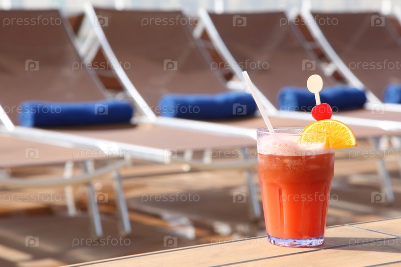 Коктейль с фруктами в стакане у шезлонгов круизного лайнера