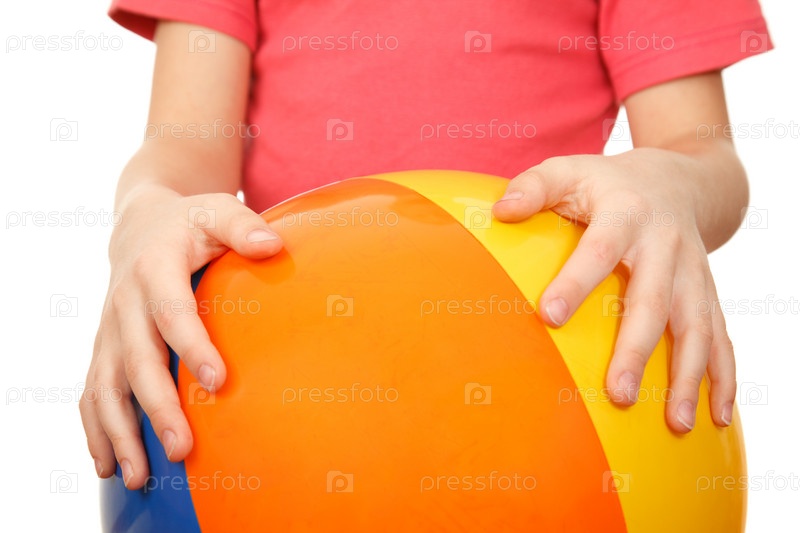Руки ребенка на надувном мяче. Изолированы на белом фоне