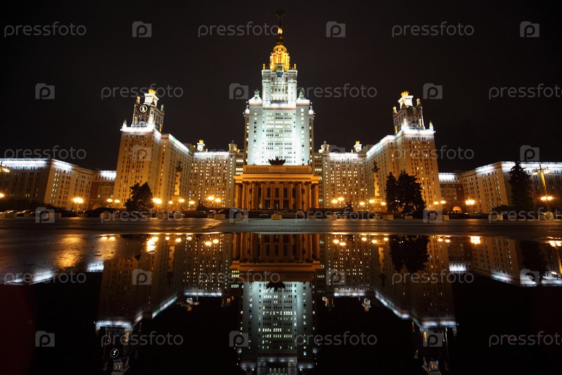 Московский государственный университет. Фасад главного здания. Ночь, осень