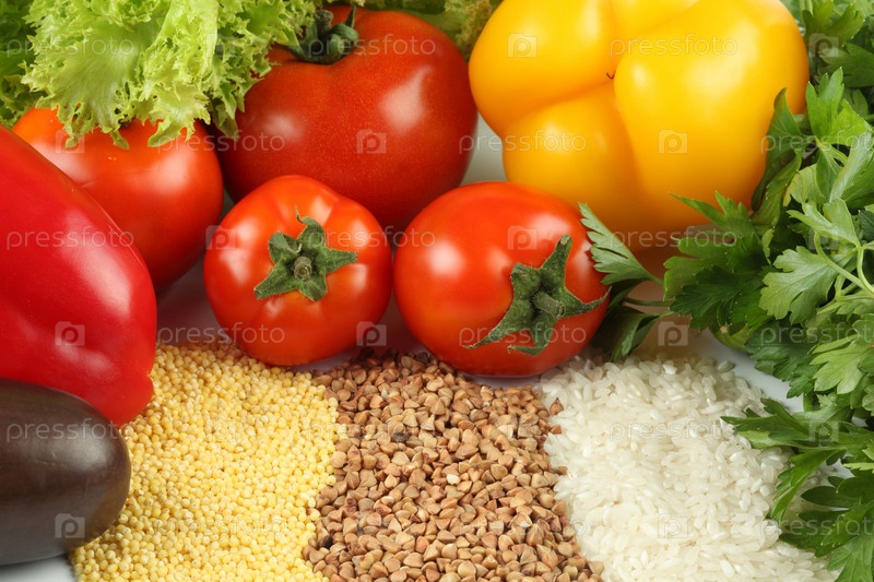 Аппетитные свежие овощи, зелень и крупы