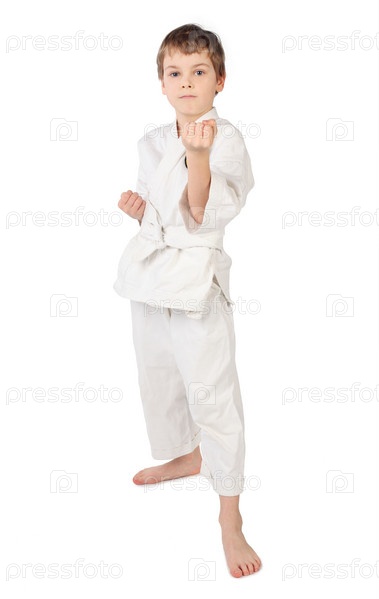 Маленький каратист на белом фоне