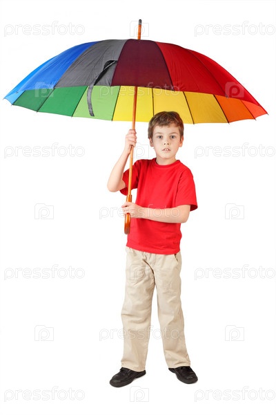 Мальчик в красной футболке с большим разноцветным зонтиком на белом фоне