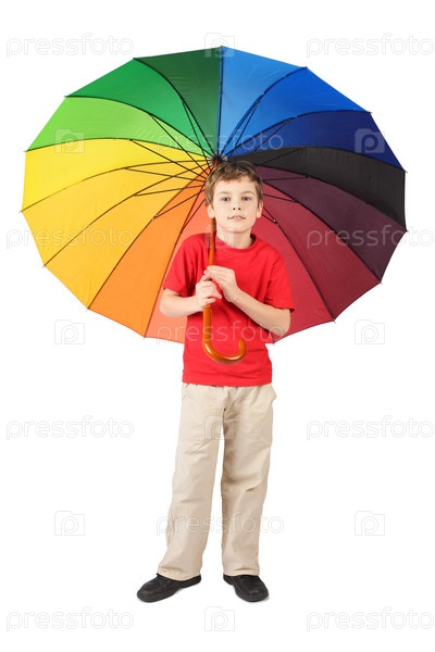 Мальчик в красной футболке с большим разноцветным зонтиком на белом фоне