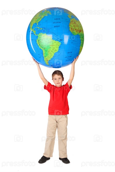 Мальчик с надувным шаром в виде планеты Земля