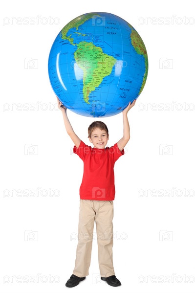 Мальчик с надувным шаром в виде планеты Земля