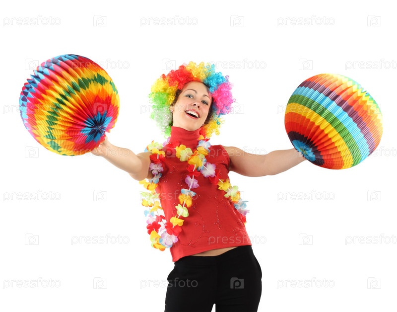 Молодая женщина в парике клоуна с гирляндами