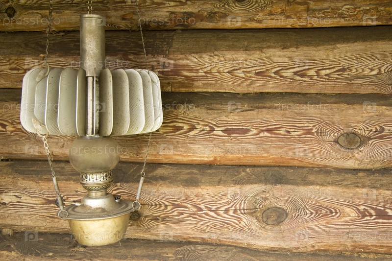 Старая керосиновая лампа на фоне деревянной стены