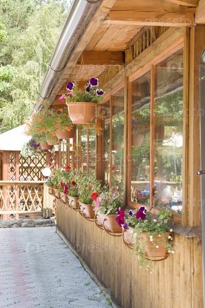 Фасад летнего домика с цветами в горшках