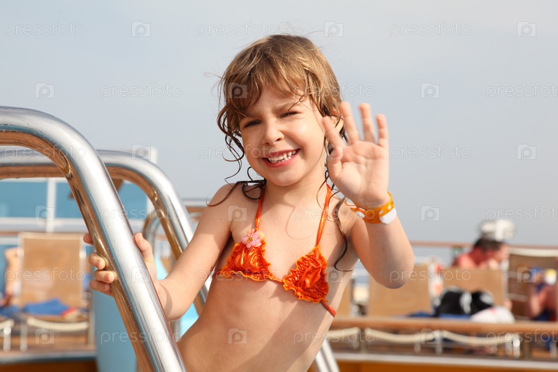 Маленькая девочка машет рукой, стоя на палубе корабля
