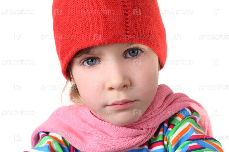 Портрет серьезной маленькой девочки в теплой шапке на белом фоне
