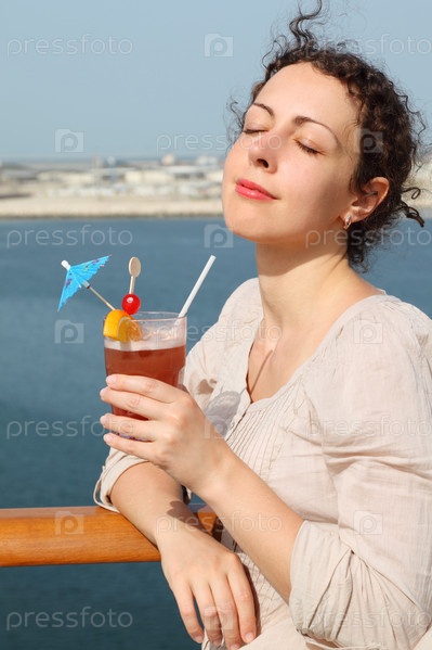 Женщина на палубе круизного лайнера пьет коктейль с фруктами