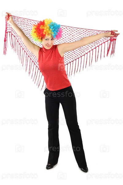 Молодая девушка в парике клоуна и с шалью на белом фоне