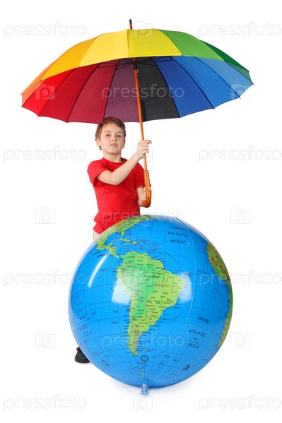 Мальчик с зонтиком надувным шаром в виде планеты Земля