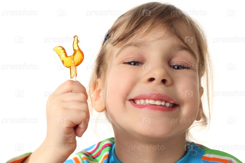Маленькая девочка с леденцом на белом фоне