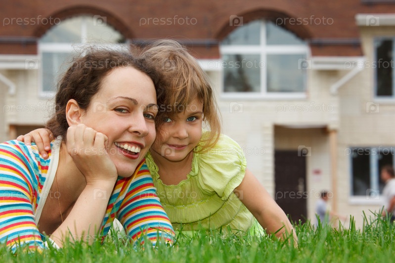 Мать и дочь лежат на лужайке