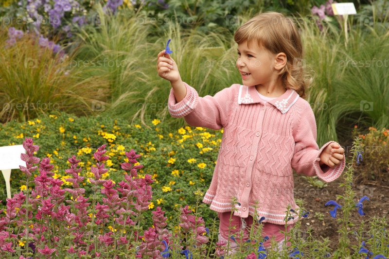 Маленькая девочка стоит среди цветов с лепестком в руке