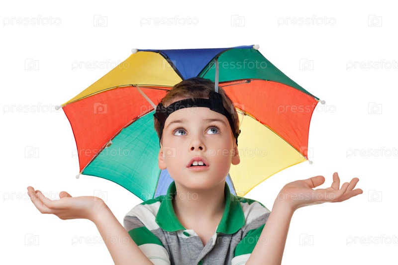 Мальчик с разноцветным зонтом на голове развел руки в стороны на белом фоне