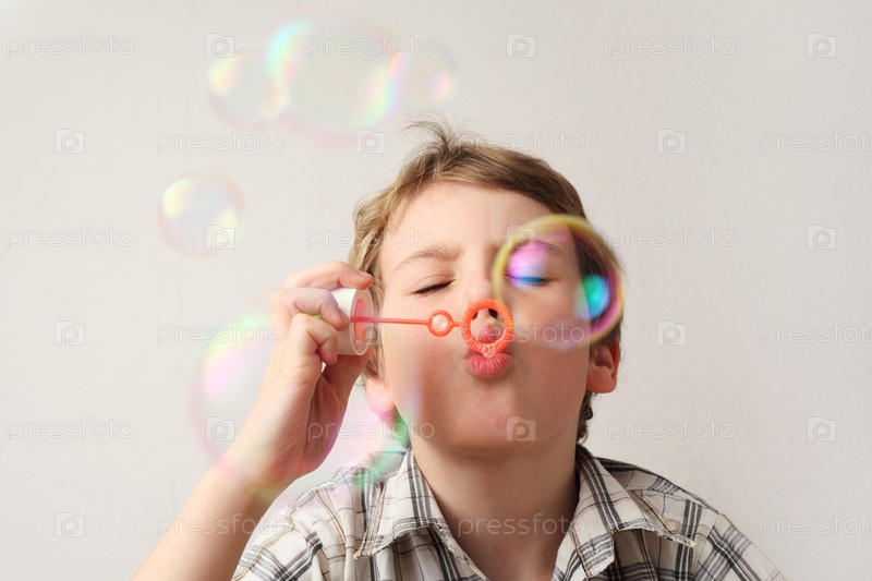 Маленький мальчик с мыльными пузырями на светлом фоне