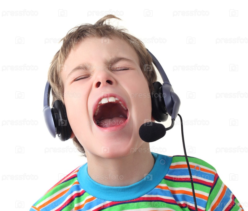 Маленький мальчик с с наушниками и микрофоном на белом фоне
