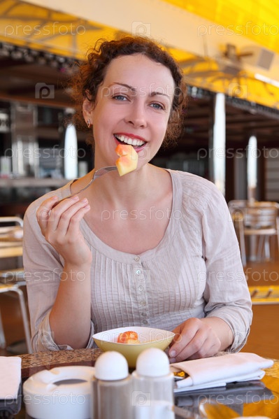 Молодая женщина обедает в ресторане на борту пассажирского лайнера