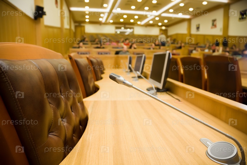 Конференц-зал с великолепными кожаными креслами, микрофонами и деревянными столами