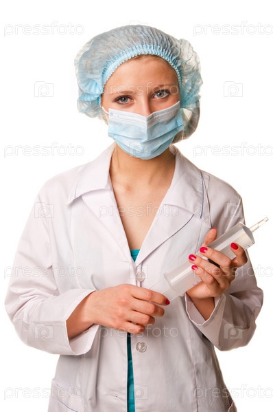 Женщина-врач в медицинской маске, которая держит шприц