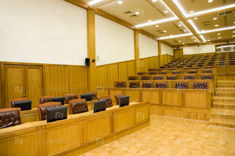 Конференц-зал с великолепными кожаными креслами, деревянными столами, микрофонами и мониторами