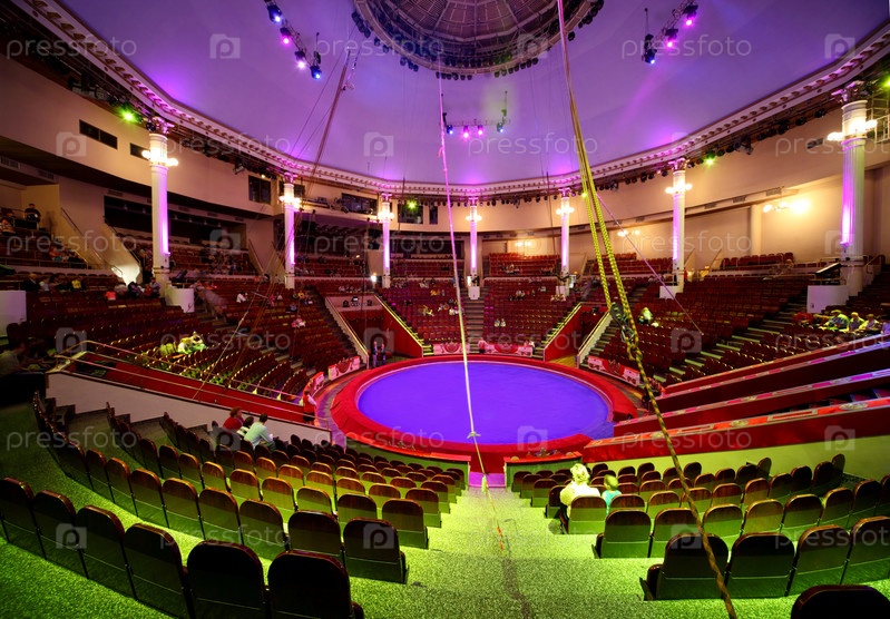 Интерьер цирка: вид на купол с сиреневым освещением и арену