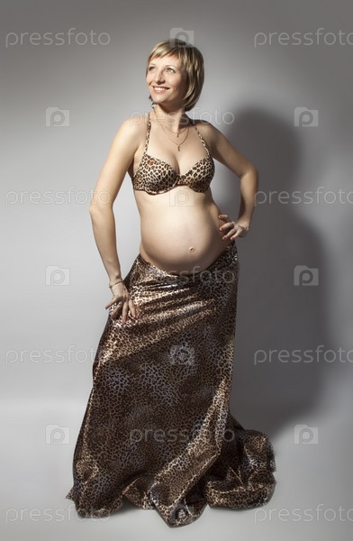 Портрет беременной женщины на сером фоне