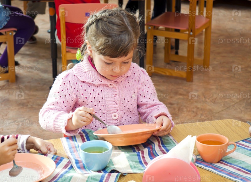 Девочка сидит за столом и ест с аппетитом