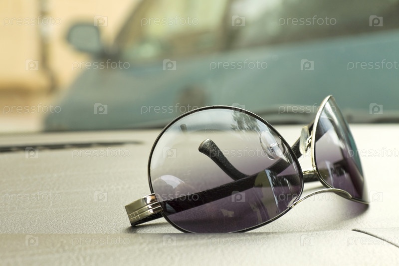 Солнцезащитные очки лежат на автомобильной панели
