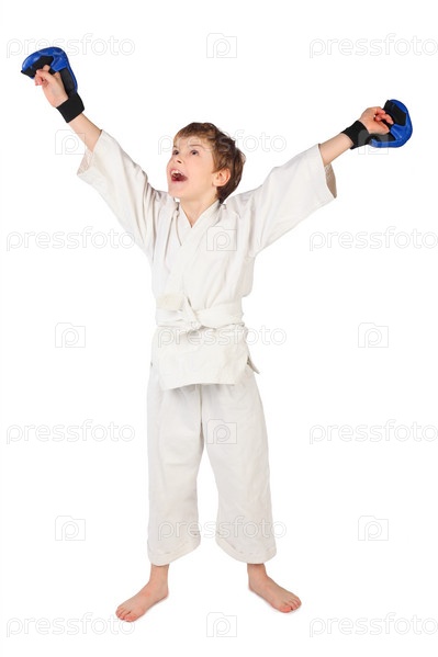 Мальчик в кимоно поднял руки вверх
