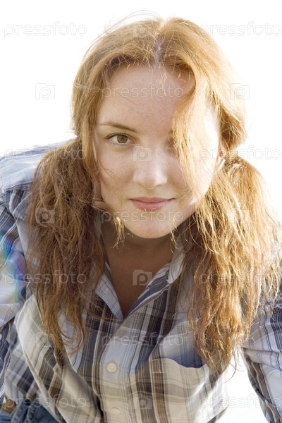 Рыжая девушка с веснушками и длинными волосами в рубашке
