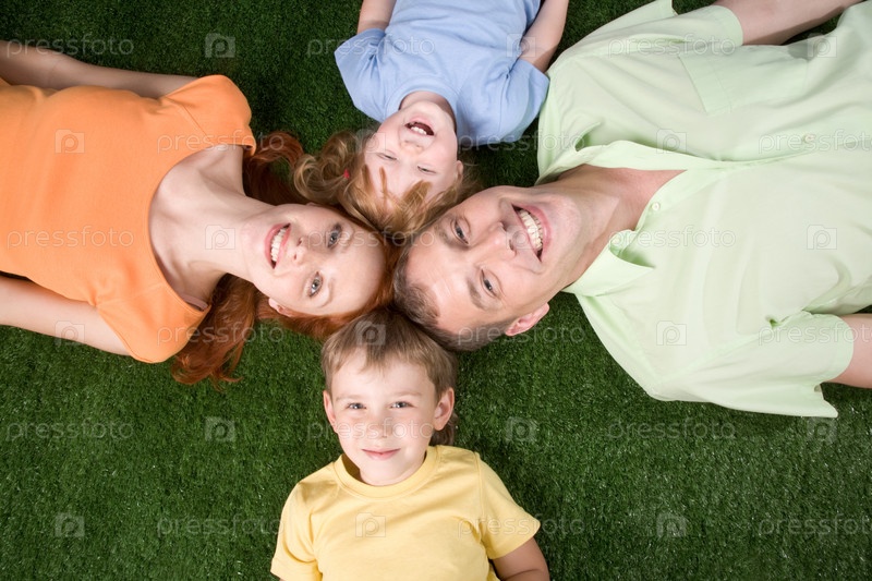 Портрет семьи, расслабляющейся на траве вместе