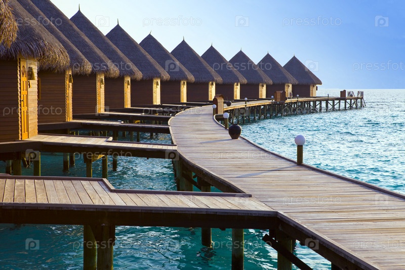 Остров в океане, Мальдивские острова. Виллы на сваях на воде