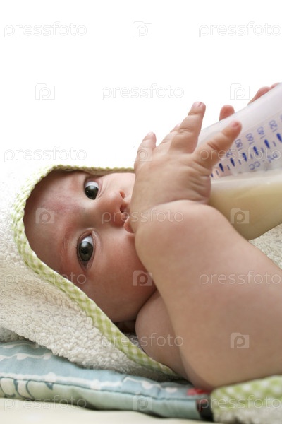 Маленький ребенок пьет молоко из бутылочки