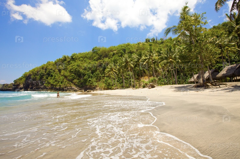 Остров в океане, песчаный пляж и пальмы