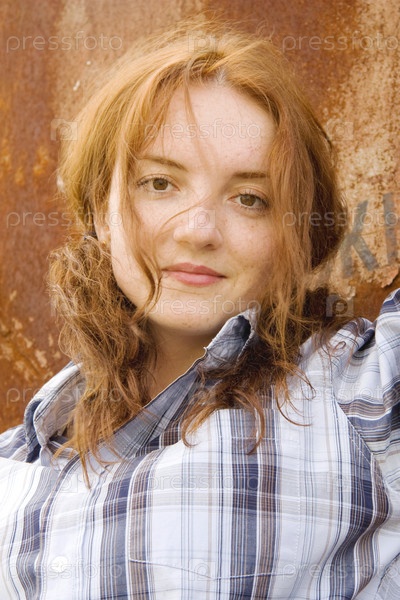 Портрет девушки в клетчатой рубашке с длинными каштановыми волосами на фоне ржавого железа